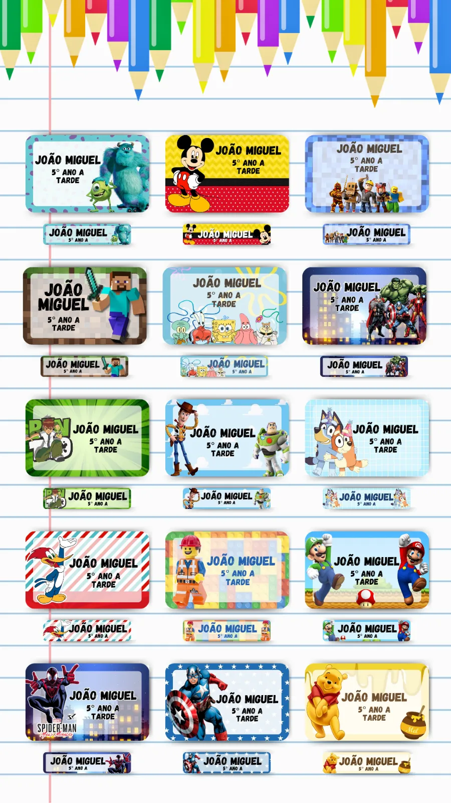 Kit 03 - 31 Etiquetas Escolares organização eficiente para seus materiais escolares. Produzidas em papel fotográfico adesivo resistente à água, garantem identificação clara e proteção contra manchas e umidade. Ideais para cadernos, livros, lancheiras e objetos escolares, facilitam a rotina de estudantes. Mantenha tudo sempre identificado com qualidade e praticidade. Adquira agora e organize seus itens com confiança!